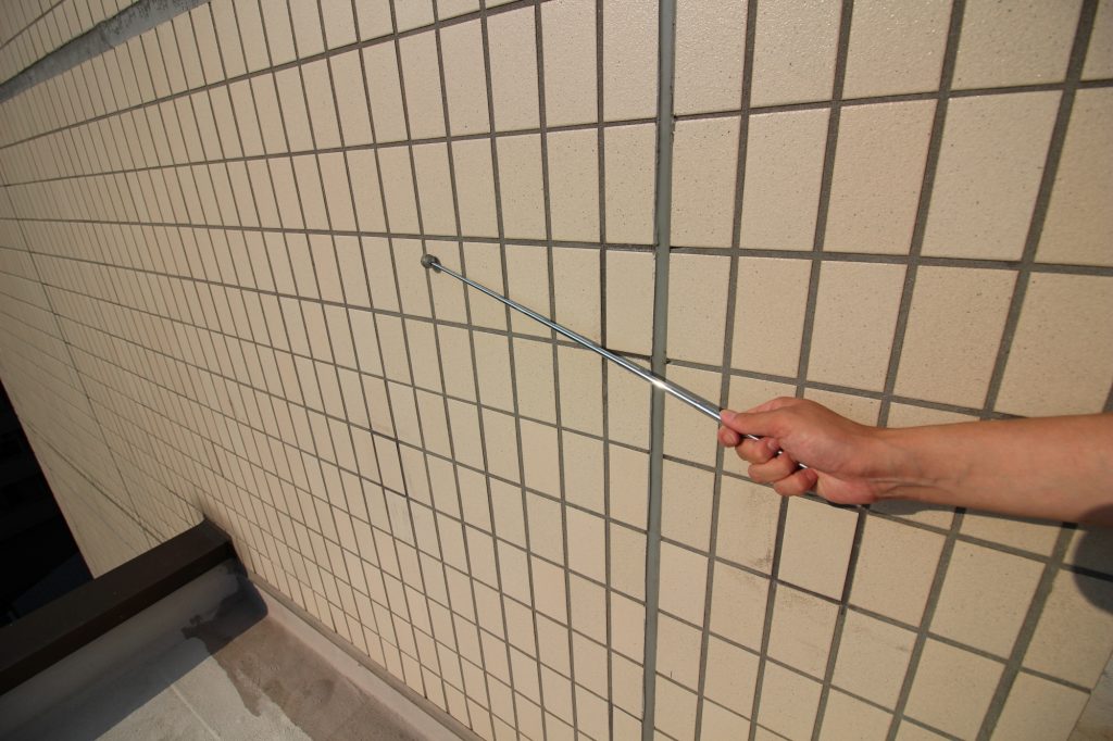 調査は、作業員が調査専用の打診棒を用いて直接外壁タイルを叩き、劣化や損傷の有無を確認。叩くことで生じる音を聞き分け、外壁タイルに浮きがないかを判断します。