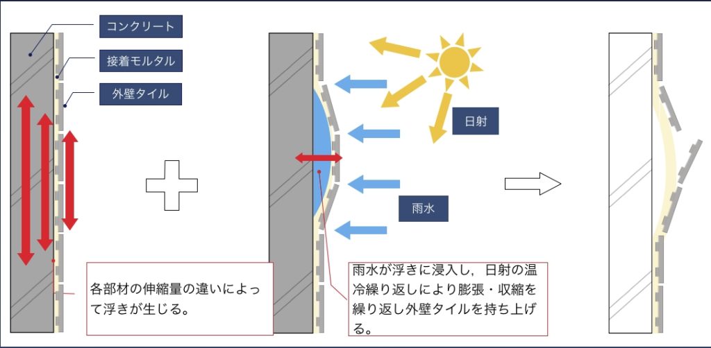 外気環境変化によって伸縮したタイルの浮いた部分に雨水が侵入し、日射による温冷を繰り返すことで、膨張・収縮が絶えずタイルに発生する状況が起きます。