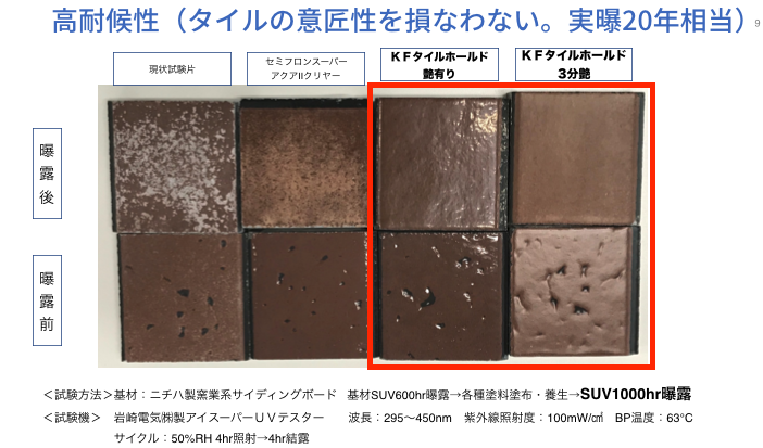 しかし、③と④のKFタイルホールドは、艶あり、3部艶ともに見た目における劣化が全くないという驚くべき結果が出たのです。